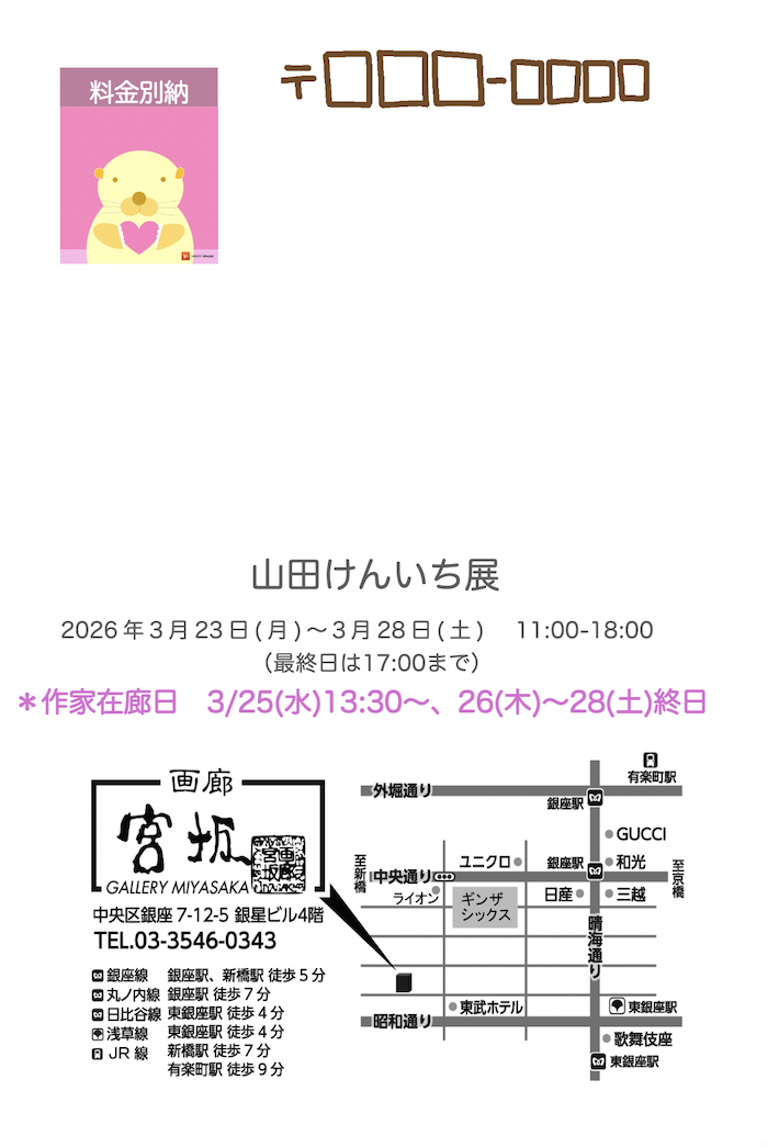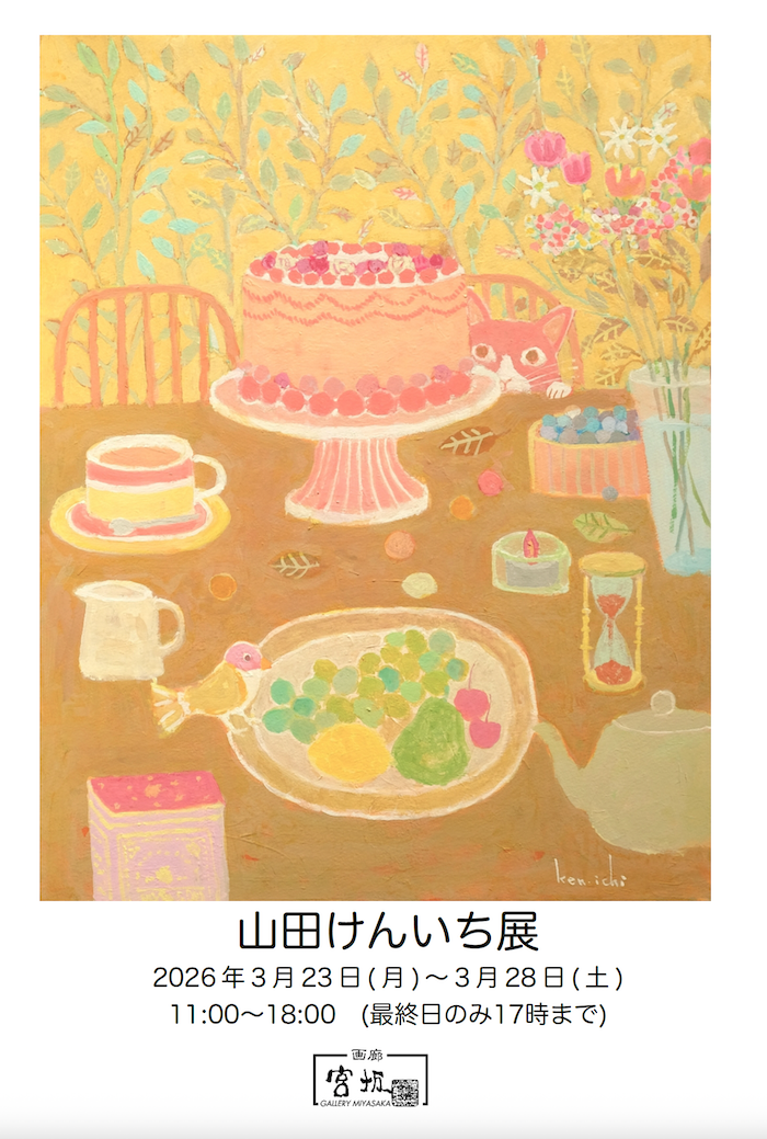 2026年 山田けんいち展 個展のお知らせお知らせ(展示会、販売、イベントなど) 東京から香川県に越してきて初めての個展です。環境の変化は作品に表れているかな?変わった気もしますし、いつもと変わらずの気もします。全体には春らしい和やかな展示になると思います。ぜひご高覧ください。 2026年3月23日(月)〜3月28日(土) 11:00〜18:00(最終日は最終日は17:00まで)画廊宮坂 東京都中央区銀座7−12−5 銀星ビル 4階作家在廊日 3/25(水)13:30〜、3/26(木)〜28(土)終日